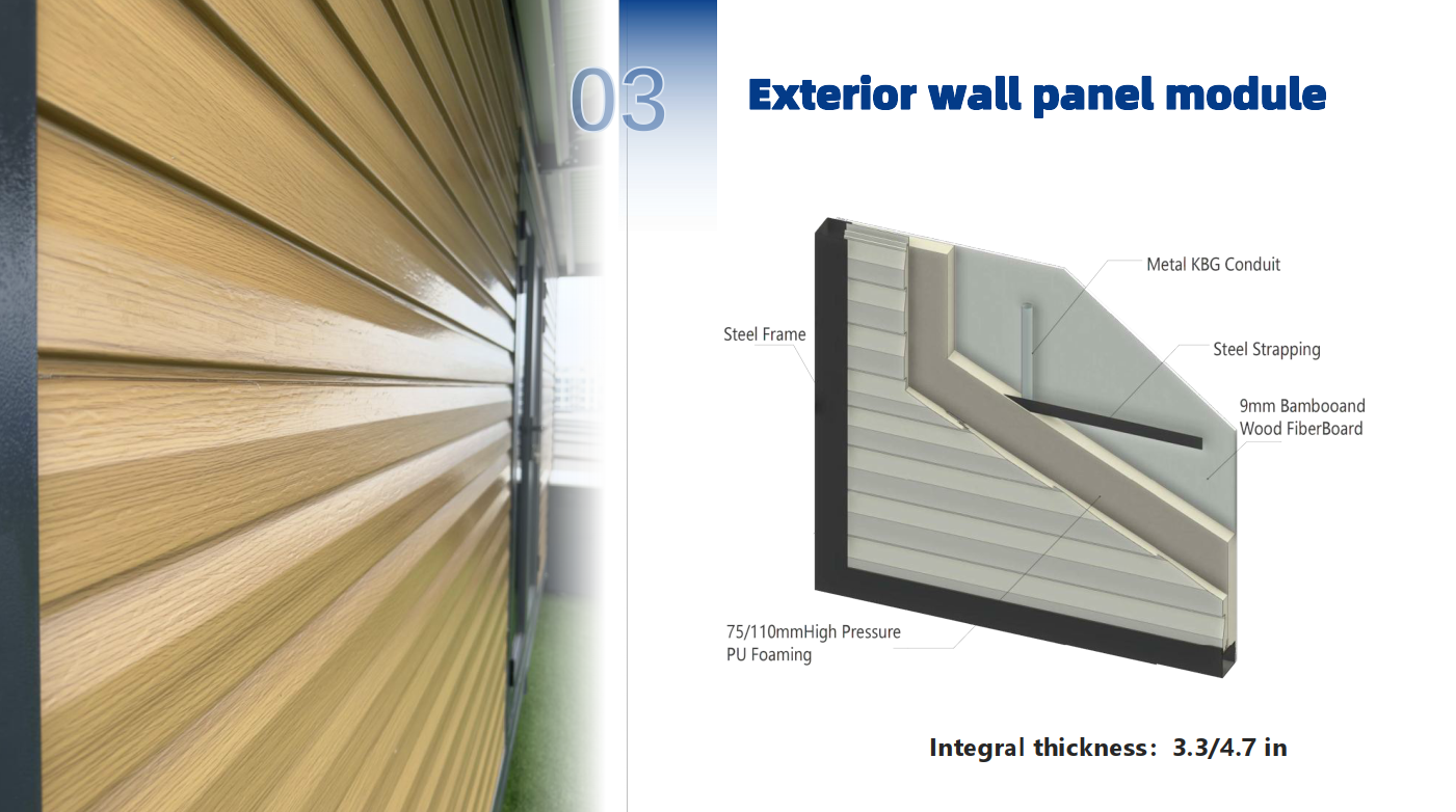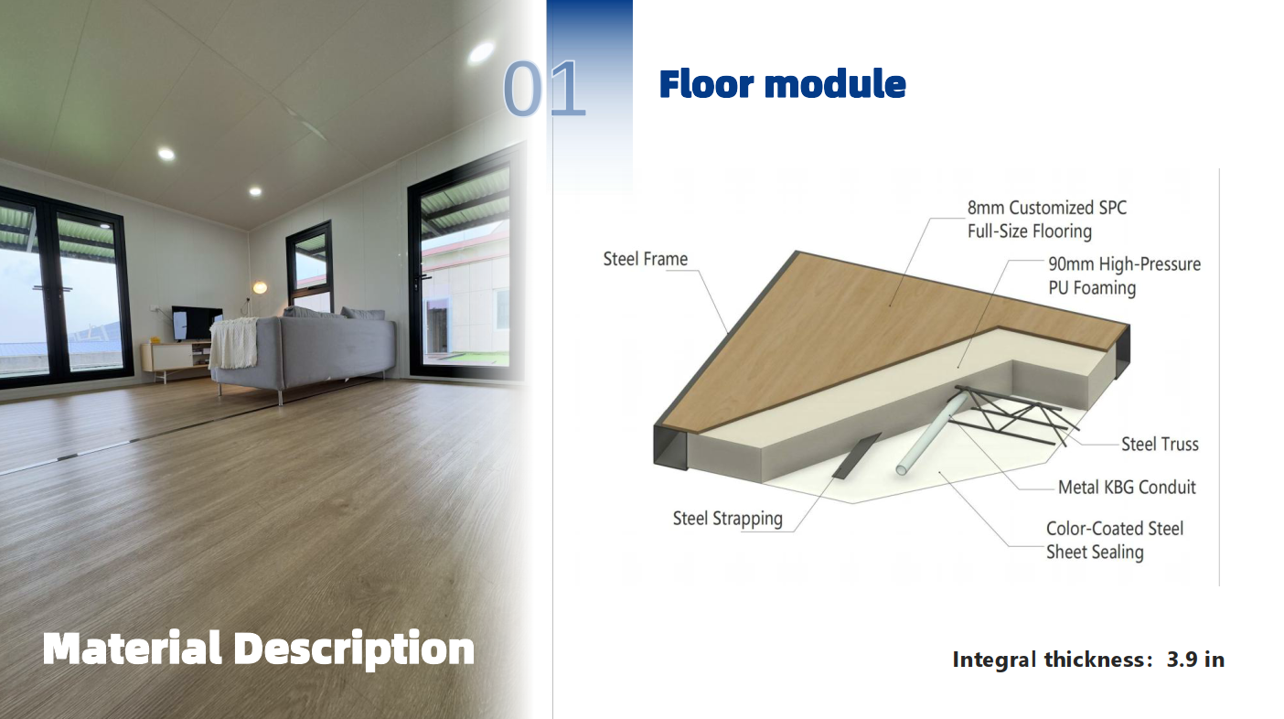 ختم صفائح الفولاذ المطلية بالألوان + إطار فولاذي + رغوة PU عالية الضغط مقاس 3.5 بوصة + دعامات فولاذية + أرضيات كاملة الحجم SPC مقاس 0.3 بوصة