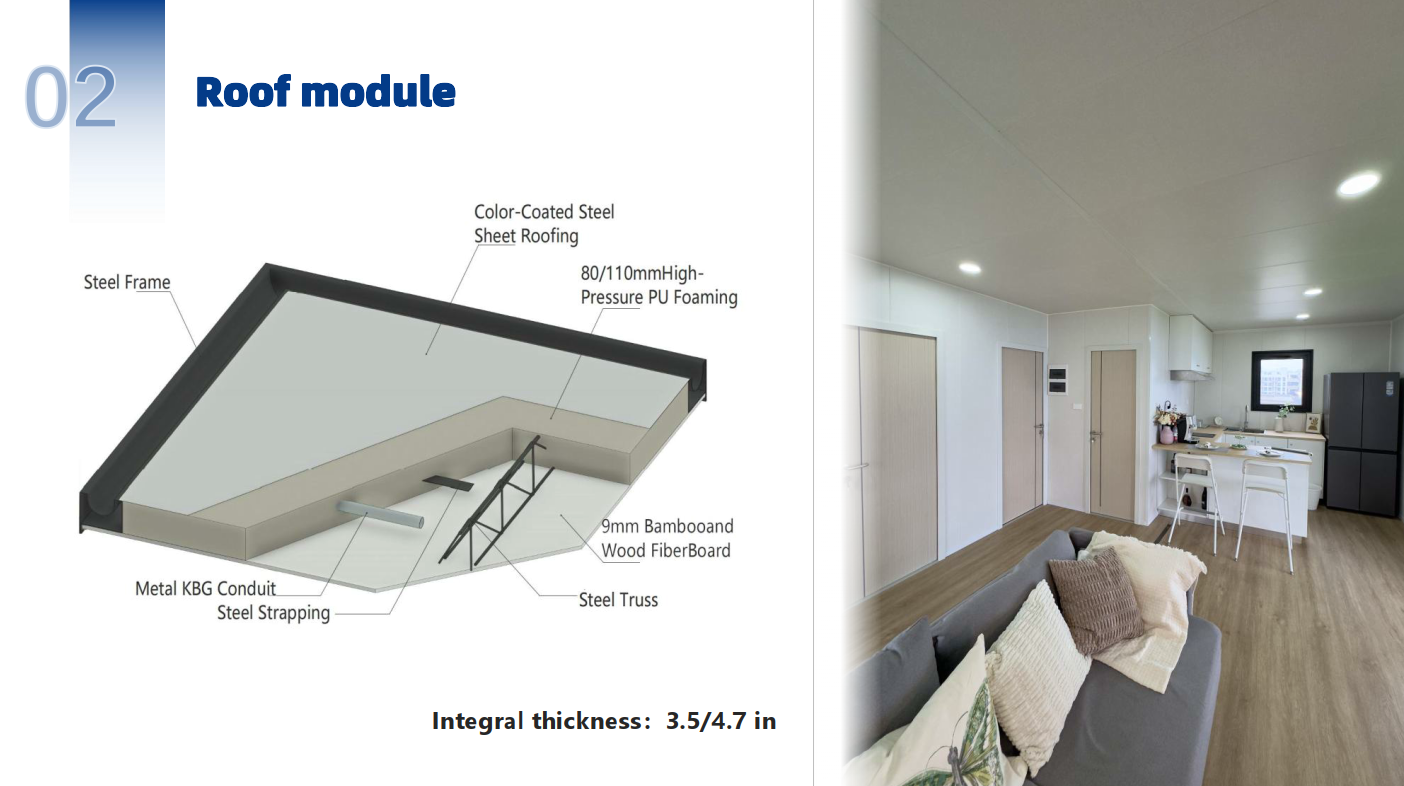 أسقف من صفائح الفولاذ المطلية بالألوان + إطار فولاذي + رغوة PU عالية الضغط مقاس 3.1 بوصة/4.3 بوصة + دعامات فولاذية + لوح ألياف من الخيزران والخشب مقاس 0.4 بوصة