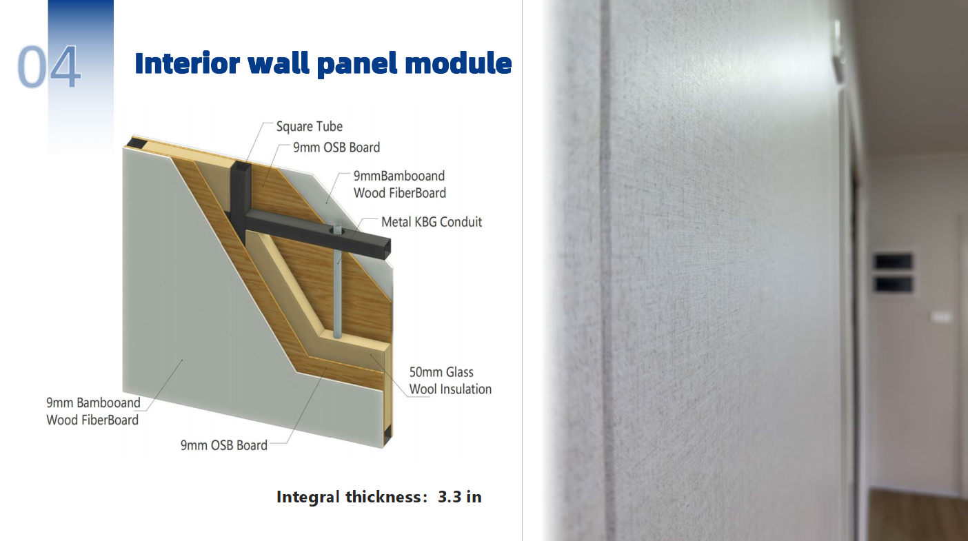 لوح ألياف من الخيزران والخشب مقاس 0.4 بوصة + لوح OSB مقاس 0.4 بوصة + أنبوب مربع فولاذي + صوف زجاجي مقاس 2 بوصة + لوح OSB مقاس 0.4 بوصة + لوح ألياف من الخيزران والخشب مقاس 0.4 بوصة