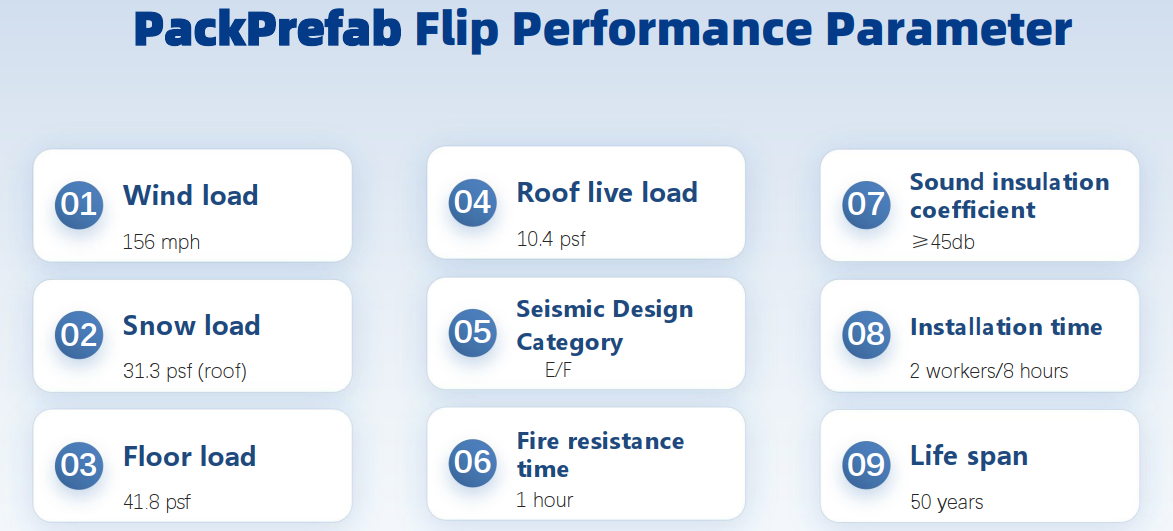 تم تصميم سلسلة Flip بجدران وأرضيات مسبقة الصنع، وتوفر الراحة أثناء السكن، والكفاءة أثناء النقل، ومساحة واسعة عند توسيعها، مع حمام مدمج. لا يتطلب تصميم المنتج سهل الاستخدام سوى بضع خطوات غير معقدة ليتم نشره على مدار ساعات.